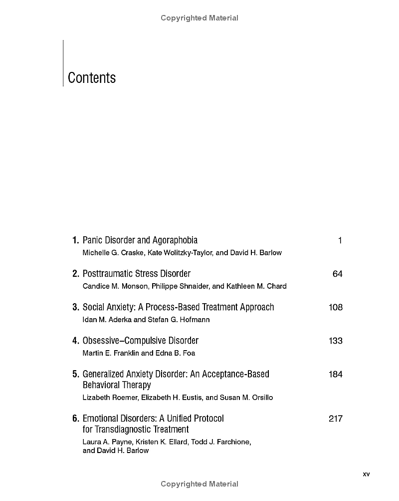 Now in a revised and expanded sixth edition, this is the leading text on evidence-based treatments for frequently encountered mental health problems. David H. Barlow has assembled preeminent experts to present their respective approaches in step-by-step detail, including extended case examples. Each chapter provides state-of-the-art information on the disorder at hand, explains the conceptual and empirical bases of intervention, and addresses the most pressing question asked by students and practitioners–“How do I do it?” Concise chapter introductions from Barlow highlight the unique features of each treatment and enhance the book’s utility for teaching and training. New to This Edition *Existing chapters thoroughly revised to incorporate the latest empirical findings and clinical practices. *Chapter on “process-based therapy,” a new third-wave approach for social anxiety. *Chapter on transdiagnostic treatment of self-injurious thoughts and behaviors. *Chapter on chronic pain.