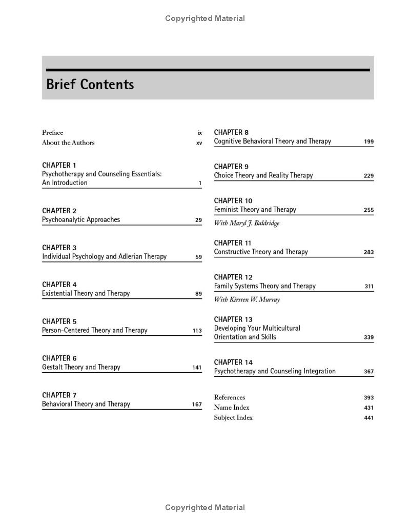 The entire book has been updated with the latest research and techniques. Pedagogical features include learner objectives, “Putting It in Practice” boxes, questions for reflection, case examples and treatment planning, and chapter summaries. Every theory is examined from cultural, gender/sexual, and spiritual perspectives. The instructor supplement package includes a Respondus test bank, chapter outlines, supplemental lecture ideas, classroom activities, and PowerPoint slides. It also includes video demonstrations corresponding to every major theory and linked to each chapter’s contents. In addition, a WPLS course will be available after publication.