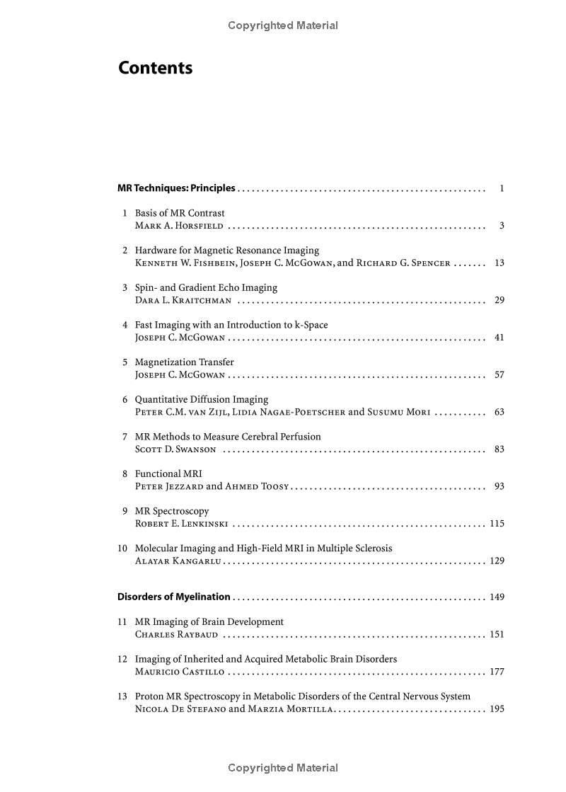 In recent decades, the use of neuroimaging techniques has resulted in outstanding progress in the diagnosis and management of neurological diseases, and this is particularly true of those diseases that affect the white matter of the brain and spinal cord. This book, written by internationally acclaimed experts, comprises a series of comprehensive and up-to-date reviews on the use of MR imaging in these major neurological conditions. The diverse available MR techniques, such as magnetization transfer MRI, diffusion-weighted MRI, MR spectroscopy, functional MRI, cell-specific MRI, perfusion MRI, and microscopic imaging with ultra-high field MRI, offer an extraordinarily powerful means of gaining fundamental in vivo insights into disease processes. The strengths and weaknesses of all these techniques in the study of multiple sclerosis and other relevant diseases are extensively considered. After an introductory section on neuroimaging technology, subsequent sections address disorders of myelination, demyelinating diseases, immune-mediated disorders, and white matter disorders related to aging and other conditions. This book provides a valuable summary of the state of the art in the field, and defines important areas for future research.